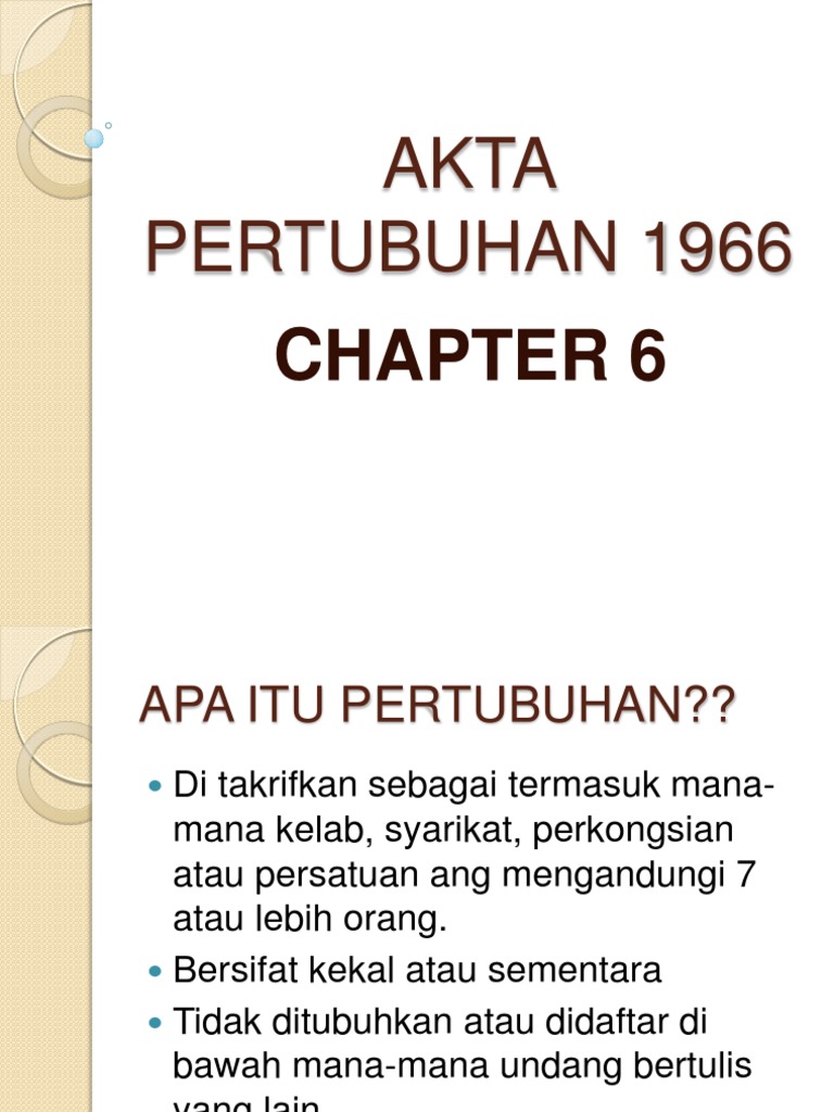 61 Kelab dan Persatuan Menurut Akta Pertubuhan 1966 takrif Kelab dan Persatuan Di bawah Seksyen 2 Akta Pertubuhan 1966 sesebuah pertubuhan adalah didefinisikan sebagai mana-mana kelab perkongsian atau persatuan yang mengandungi 7 orang atau lebih tidak kira apa jua jenis atau tujuannya sama ada sementara atau kekal tetapi tidak termasuk badan-badan. The Societies Act 1966 in its current form 1 January 2006 consists of 3 Parts containing 70 sections and 2 schedules including 10 amendments. 0 Full PDFs related to this paper.